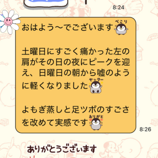 「よもぎ蒸しと足つぼの凄さを改めて実感」 隔週でご来店のH様。2週間に1回の身体のリセットでお仕事も頑張られています。 先日のご来店時に、左の肩がすごく痛い‥とお話されていました。 足つぼで、念入りに肩の反射区を時間を掛けて老廃物を削る、削...